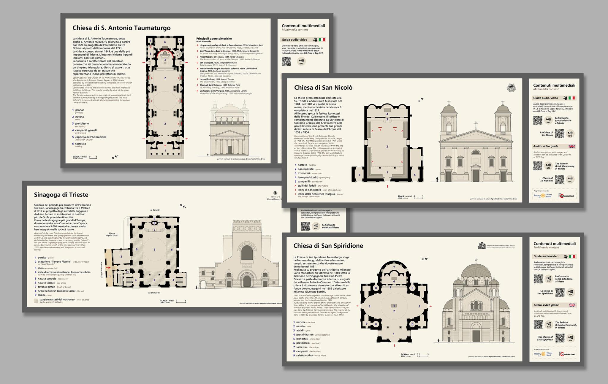 I pannelli riprendono il format già utilizzato in analoghi nostri progetti riguardanti altri edifici di culto italiani: in ogni pannello sono rappresentati, sia visivamente che tattilmente, grazie alla speciale tecnica di stampa, i disegni della pianta e della facciata principale dell'edificio, con testi in nero (italiano e inglese) e in Braille. Mediante QR code e tag NFC sono rese disponibili guide audio-video con sottotitoli e immagini dinamiche in italiano, inglese e Lingua dei Segni Italiana (LIS). Proprio per favorire la conoscenza delle diverse confessioni religiose il nostro format è stato arricchito con una specifica integrazione dei contenuti multimediali: oltre alla guida storico-artistica che accompagna alla scoperta di ciascun edificio di culto, sono infatti fruibili, mediante QR code dedicati, ulteriori file audio-video che raccontano la storia, il ruolo e l'evoluzione di ciascuna comunità religiosa nella città di Trieste.